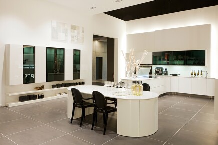 Was verbirgt sich hier nicht alles hinter formschönen Küchenfronten: Auszüge und Schubkästen, hochwertige Elektrogeräte wie Pyrolyse-Backofen und Dampfgarer im Seitenschrank. Der Esstisch nimmt seitlich elegant das Tischgeschirr auf. Versenkbare DownDraft-Tischhaube aus weißem, gebogenem Glas und ein autarkes Induktionskochfeld komplettieren das Premiumsegment.